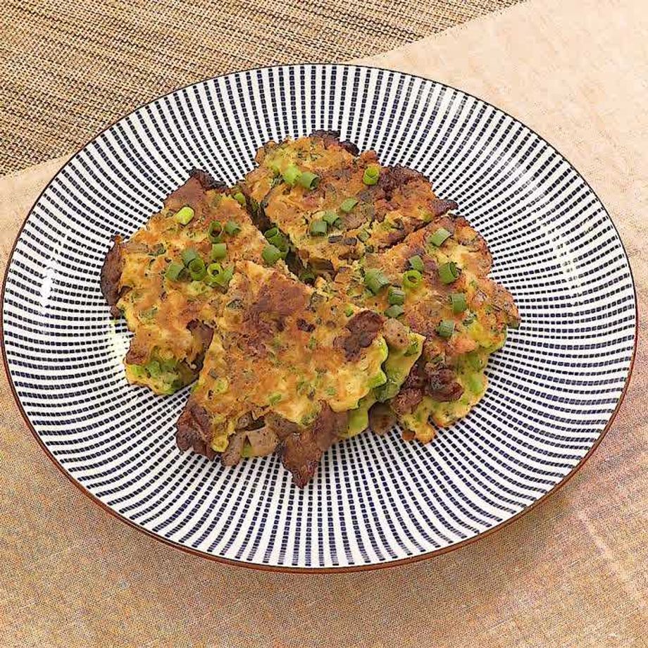 フライパンに残りのサラダ油を入れて中火で熱し、生地の2/3量を流し入れて丸く形をととのえる。まわりのねぎ入り生地が固まったら、牛肉こんにゃくをのせて残りのねぎ入り生地を流し入れる。裏返してふたをし、焼き色がつくまで弱火で5〜7分焼く。