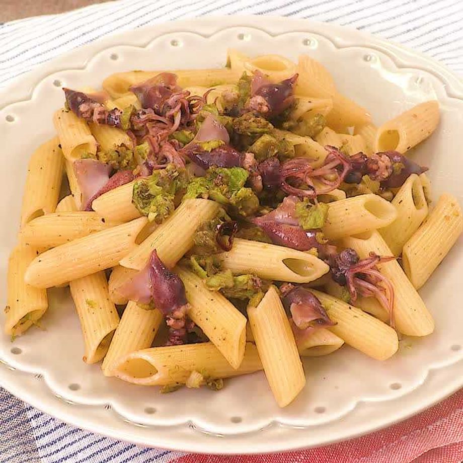 フライパンにオリーブオイル、にんにく、唐辛子を入れて弱火で熱する。香りが立ってきたら混ぜ、ふきのとうを加えて火が通るまで中火で炒める。ホタルイカ、ペンネ、塩、こしょうを加えてさっと炒める。