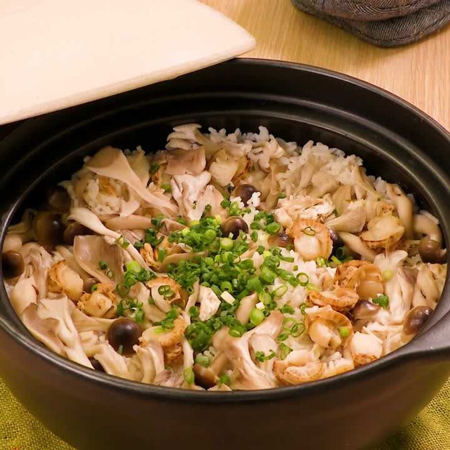 きのこをふんだんに使った人気の土鍋ご飯をご紹介します。ベビーホタテを使って旨味たっぷり!おこげが香ばしく、何杯でも食べたくなる味わいです♪