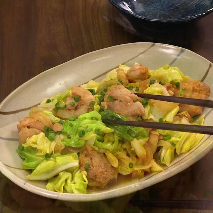 フライパンにサラダ油を入れて中火で熱し、2の具材を加えて鶏肉の表面の色が変わるまで焼く。ふたをして弱火で3分蒸し焼きにする。キャベツを加えて中火で2分炒める。