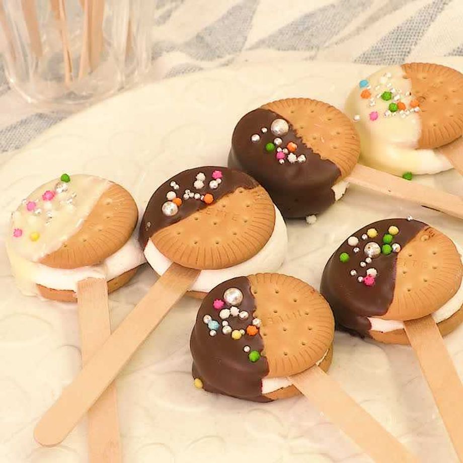 2のマシュマロに棒を埋め込み、残りのビスケットで挟む。