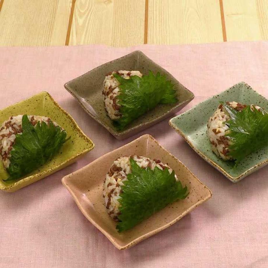 ラップに3をのせ、三角ににぎり、大葉で包む。