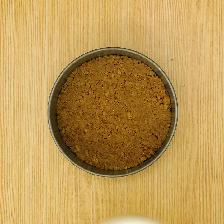 型の底にクッキングシートを敷く。ビニール袋にビスケットを入れ、めん棒で袋の上からたたき、細かくなったら溶かしバターを加えてなじませ、型に敷き詰める。冷蔵庫で15分程冷やす。
