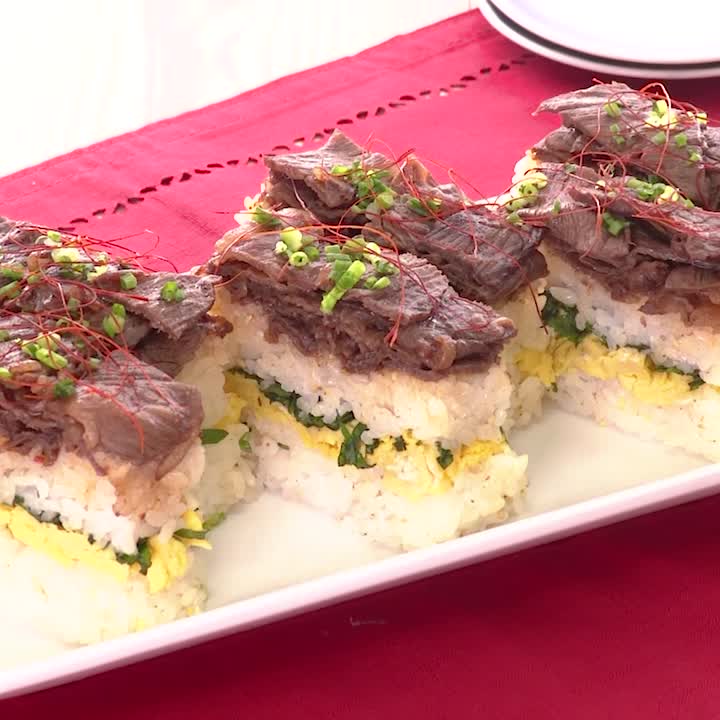 彩りきれいな押し寿司でおもてなし♪大切な人への気持ちを込めて作りましょう!炒り卵はレンチンでお手軽にできます♪