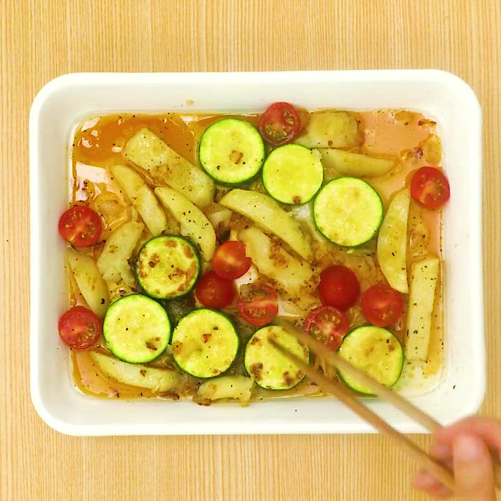 フライパンにオリーブオイルを入れて熱し、玉ねぎを入れて中火で透き通るまで炒める。ズッキーニ、じゃがいもを加えて中火で2〜3分程ズッキーニに火が通るまで炒める。塩こしょうを加えて全体を炒め合わせる。