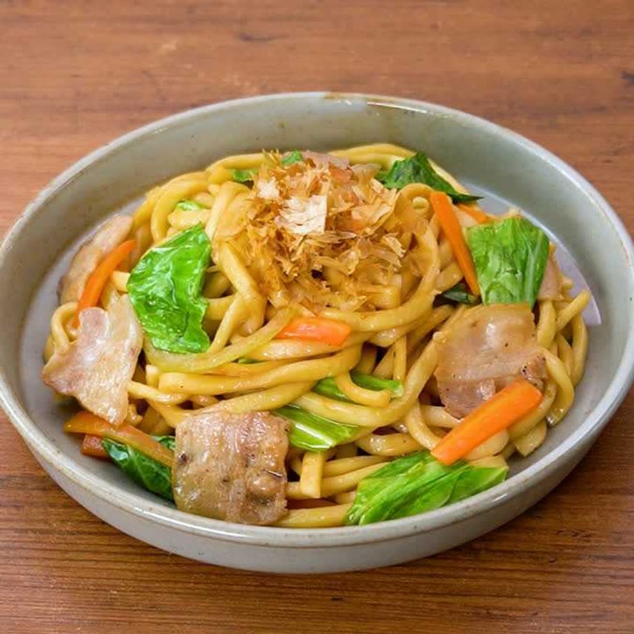 あっさりとした和風味の「基本の焼きうどん」のレシピを紹介します。お好きな野菜を入れて作ってみてください。かつお節をたっぷりとのせると口の中に旨みが広がります。飲んだあとのシメにおすすめですよ♪