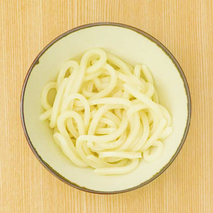 耐熱容器にうどんを入れて、ふんわりとラップをして600Wのレンジで袋の表記時間通りに加熱する。ボウルに氷水を入れ、うどんを加えて氷水でしめる。水気をきる。