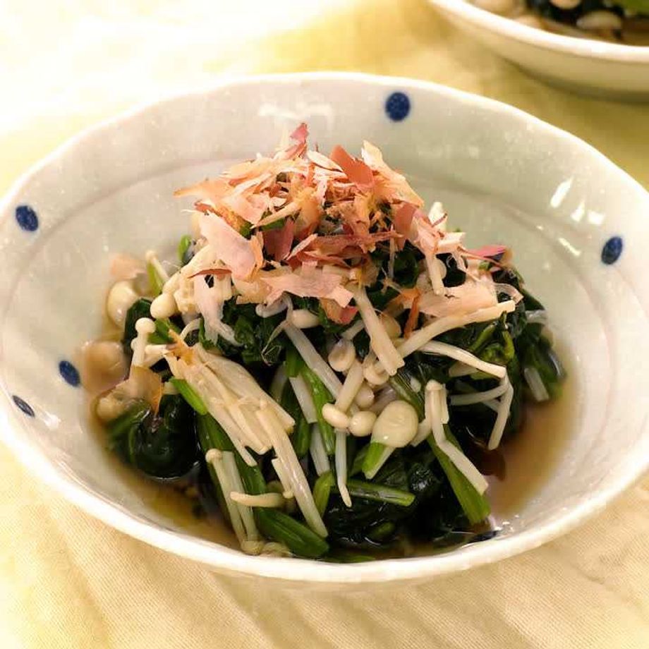 鍋にたっぷりの湯をわかし、ほうれん草、えのきを入れてゆで、しんなりしてきたら30秒程ゆでて取り出す。冷水にとって水気をよく絞る。