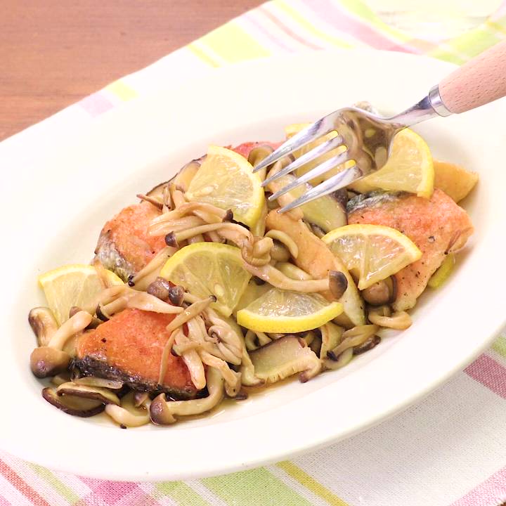 炒めたきのこと鮭にレモン汁を入れて、さっぱりマリネに♪いちょう切りのレモンで見た目もおしゃれに!おもてなしにもおすすめです。