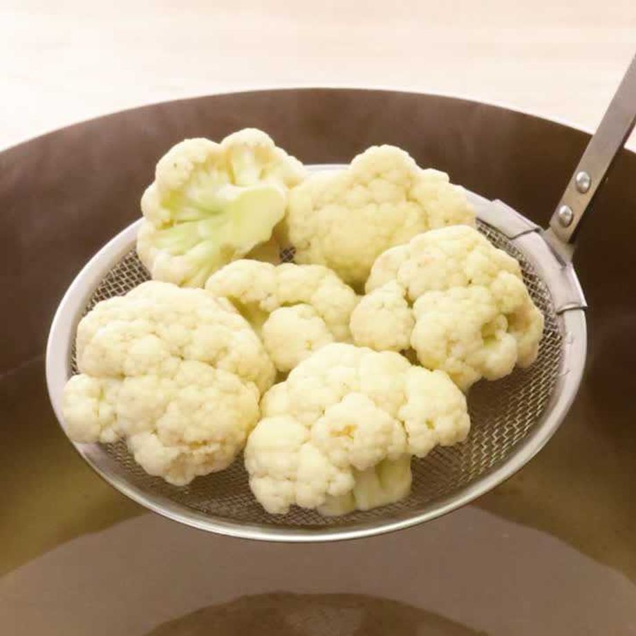 鍋に水を入れてわかし、沸騰したら、塩、カリフラワーを入れて3分程お好みの固さにゆでる。