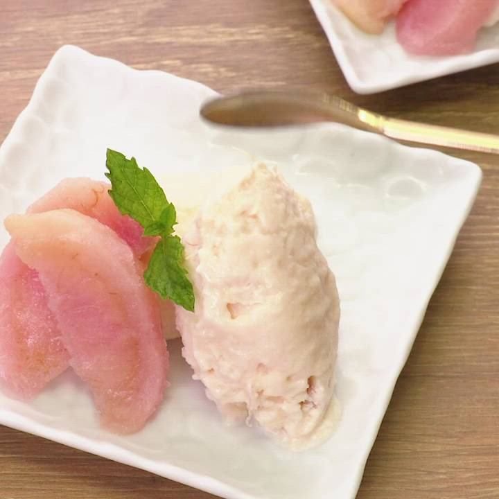 クリームチーズのコクと、ももの甘味がたまらないシャーベットです。ももはコンポートにして混ぜ込むので果肉感が存分に味わえます。