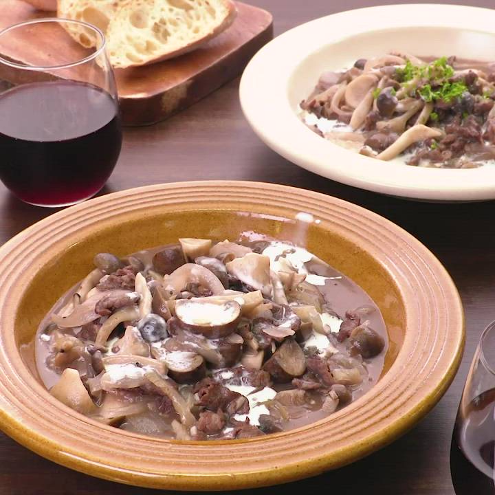 きのこをたっぷりと使い、風味豊かに仕上げました!牛こま肉を加えて食べ応え十分な一品に。お好みでバケットを添えてお召し上がりください♪