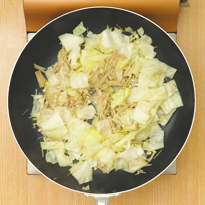 フライパンにごま油を入れて中火で熱し、えのき、キャベツを入れてしんなりするまで炒める。