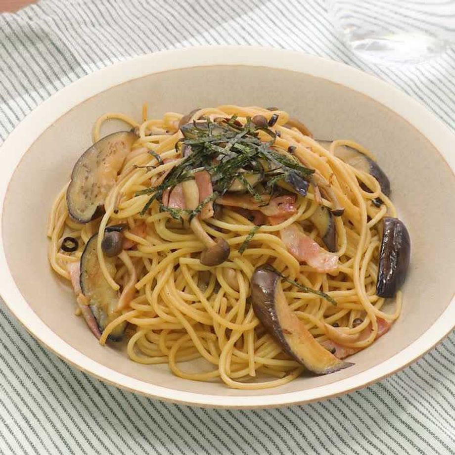 フライパンにオリーブオイル、にんにく、唐辛子を入れて中火にかけ、香りが立ったらベーコン、なす、しめじを加えてしんなりするまで炒める。