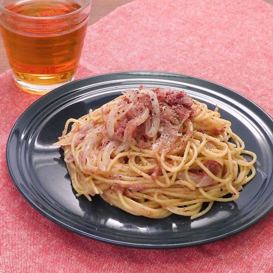 もちもちした食感の、コンビーフの水パスタをご紹介!パスタは水に漬けることで、ゆでずに炒めて仕上げる、画期的な作り方です。コーンビーフの旨味と玉ねぎの甘さが絶妙♪新感覚のパスタをぜひお試しください!