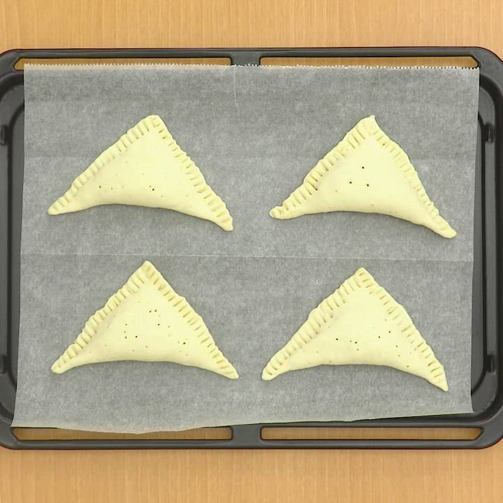 冷凍パイシートの外側1cmを空けて6、とろけるスライスチーズをのせる。三角形になるように冷凍パイシートを重ねて押さえ、端をフォークで押しながら閉じる。