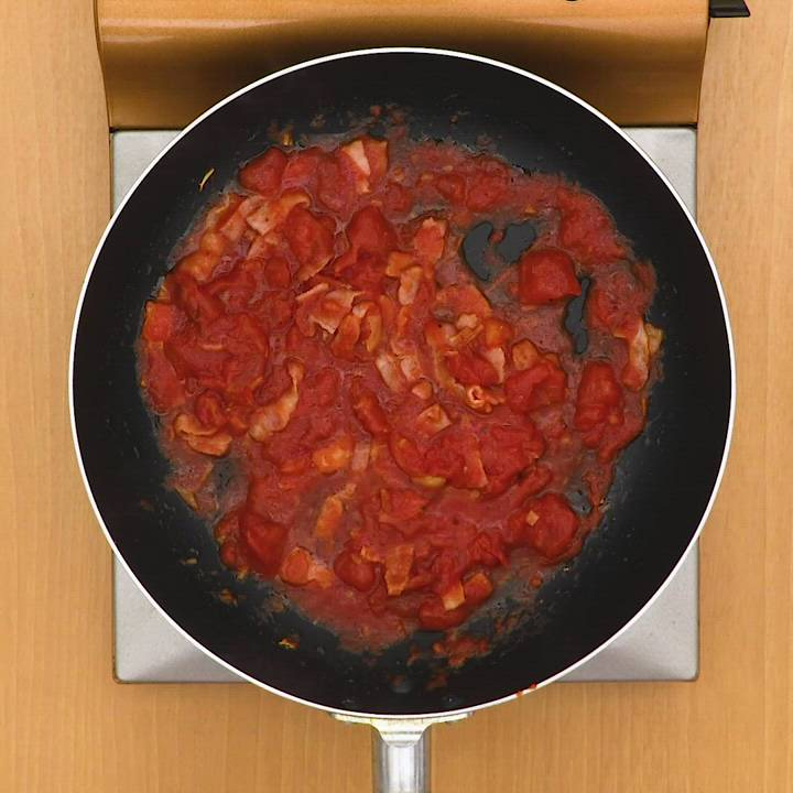 フライパンにオリーブオイル、にんにくを入れて弱火で熱し、香りがたってきたらベーコンを加えて焼き色がつくまで中火で炒める。カットトマト缶、塩、黒こしょう、砂糖を加えて煮立ったら、ふたをして弱火で5分煮る。
