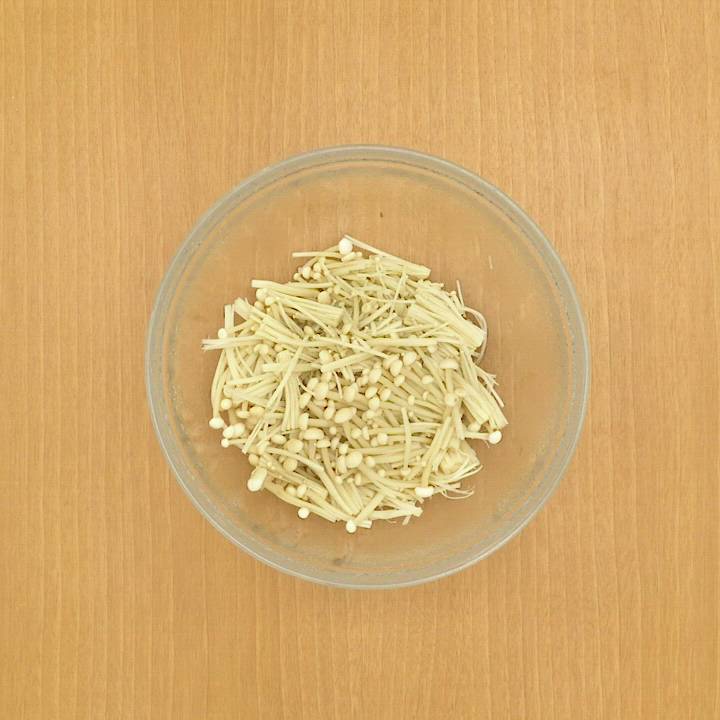 えのきは根元を切り落とし、2等分に切る。耐熱容器に入れてふんわりとラップをし、600Wのレンジで2分加熱し、粗熱をとる。
