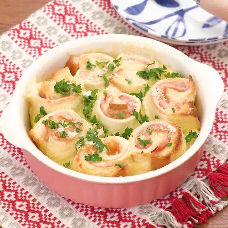 ハムとチーズをのせてまるめ、一口サイズに切って耐熱皿につめることで、とっても食べやすく見た目も可愛いお食事系フレンチトーストが作れます♪