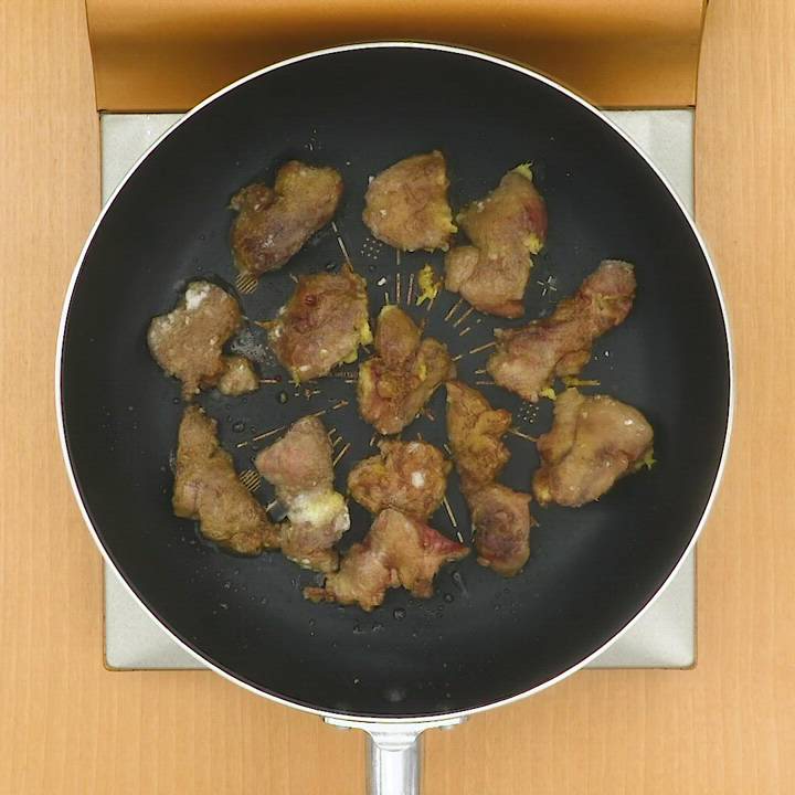 同じフライパンに残りのサラダ油(大さじ1/2)、おろしにんにく、おろししょうがを入れて中火で熱し、鶏レバーを加えて肉の色が変わるまで両面焼き、ふたをしてをして1〜2分、肉に火が通るまで蒸し焼きにする。