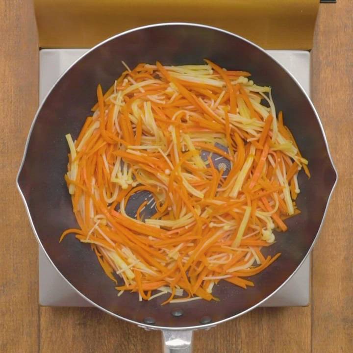 フライパンにサラダ油を入れて中火で熱し、にんじんを入れてしんなりとするまで炒める。えのきを加えてえのきがしんなりとするまで炒める。