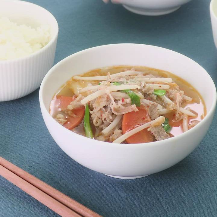 春雨や野菜をたくさん入れて、食べ応えのある一品に仕上げました!キムチを加えることで風味豊かな味わいになります。