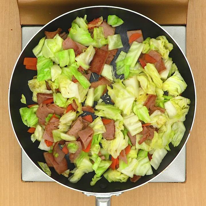 フライパンにごま油を入れて熱し、スパムを入れて中火で1分程炒め、キャベツ、にんじんを加えてしんなりするまで炒める。