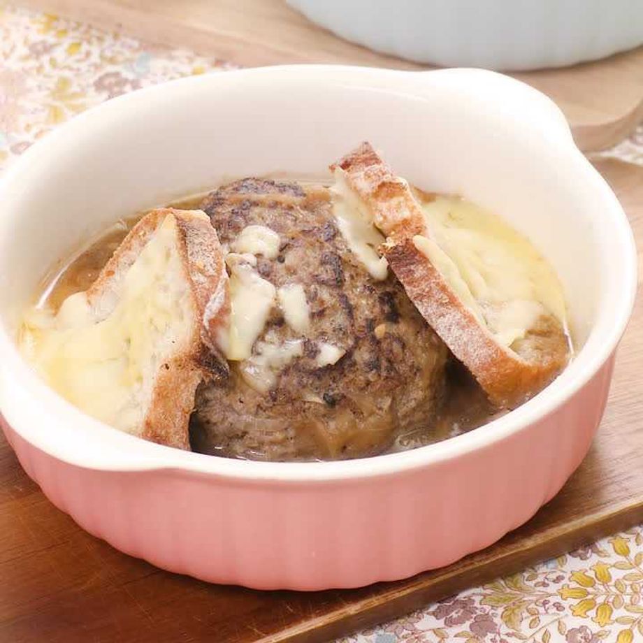 玉ねぎの甘みとお肉の旨味がスープに溶けた、グラタン仕立てのハンバーグのご紹介です。ちょっと手間をかけておもてなしにいかがでしょうか。