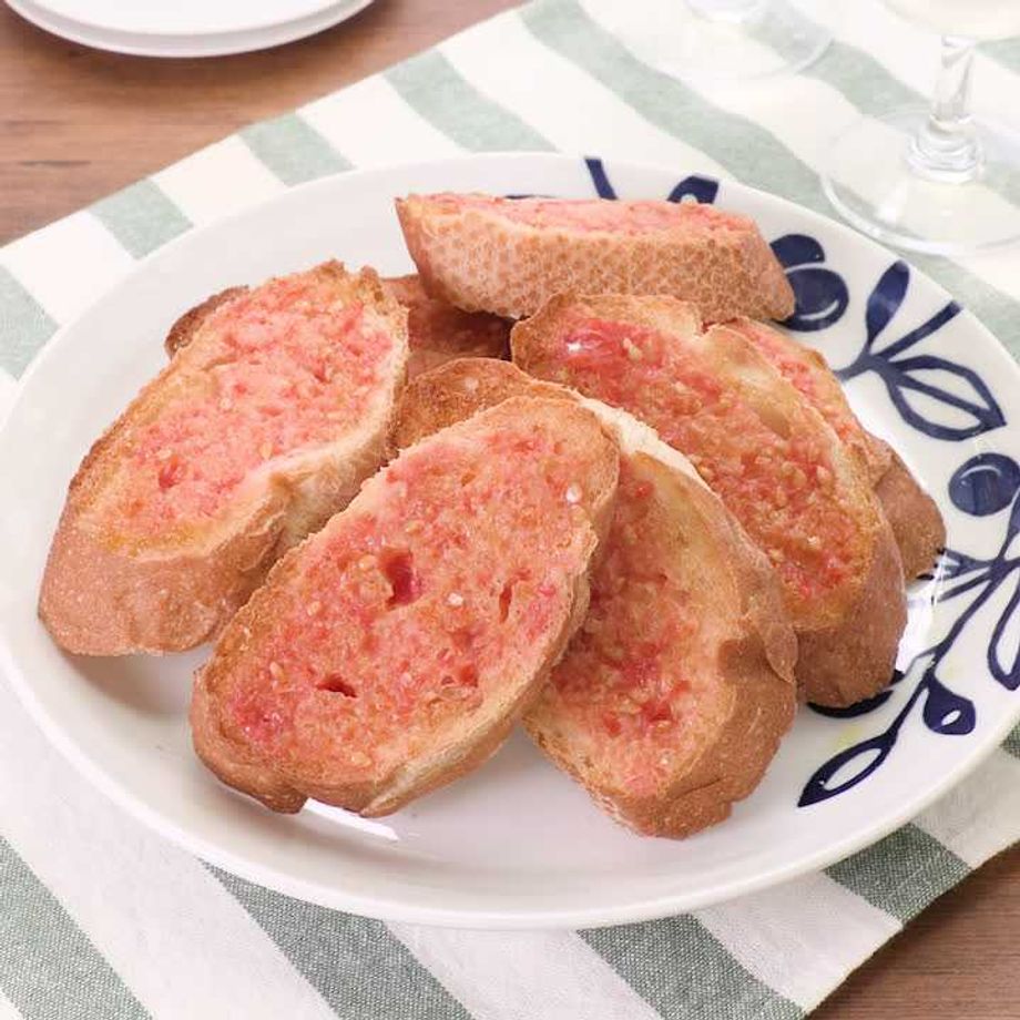 スペインのカタルーニャ地方で食べられている郷土料理をご家庭で簡単に!バゲットにトマトとにんにくをつけていただくシンプルながらやみつきになる一品です。本場ではパンににんにくとトマトをこすりつけますが、今回はご家庭で作りやすいようにトマトはすりおろしています♪お好みで生ハムやアンチョビをのせて食べるのもおすすめです。