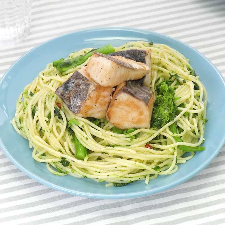 鍋に湯をわかし、塩(分量外:適量)、スパゲティを入れて袋の表示時間通りにゆでる。ゆで上がり2分前になったら菜の花を加えてゆで、水気を切る。ゆで汁は大さじ2取っておく。