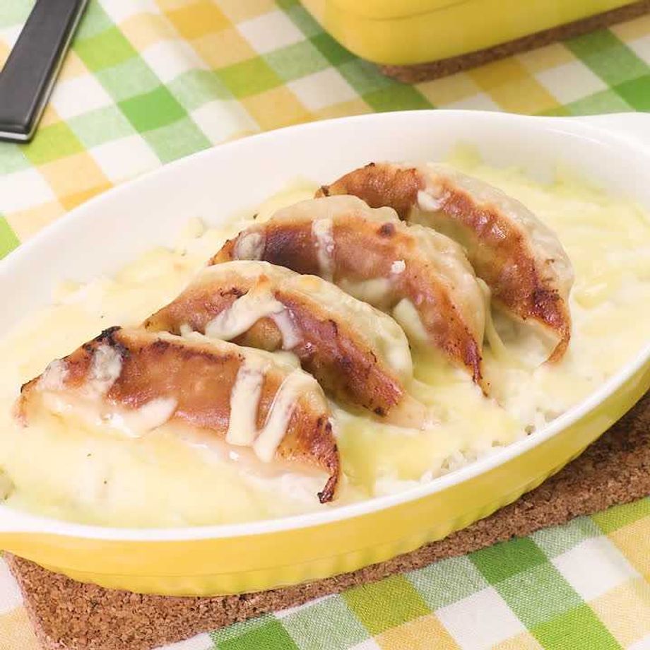 耐熱容器にごはん、ホワイトソース、焼き餃子を半量ずつ順に盛り、ピザ用チーズをちらす。同様に計2個つくる。トースターで焼き色がつくまで3〜4分程焼く。