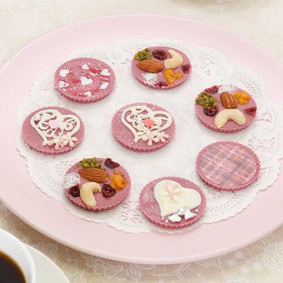 シリコンカップにルビーチョコレートを等分に流し入れ、固まらないうちにお好きな☆で飾る。冷蔵庫で1時間程冷やし固める。