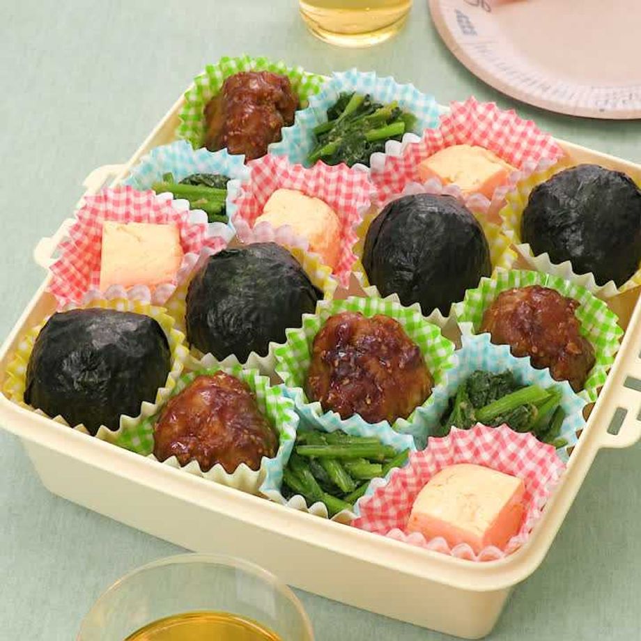 コロンとしたおかずやおにぎりを詰めたボリューム満点なお弁当をご紹介♪具材を変えてアレンジも楽しめます!お弁当を持ってピクニックに行きませんか?