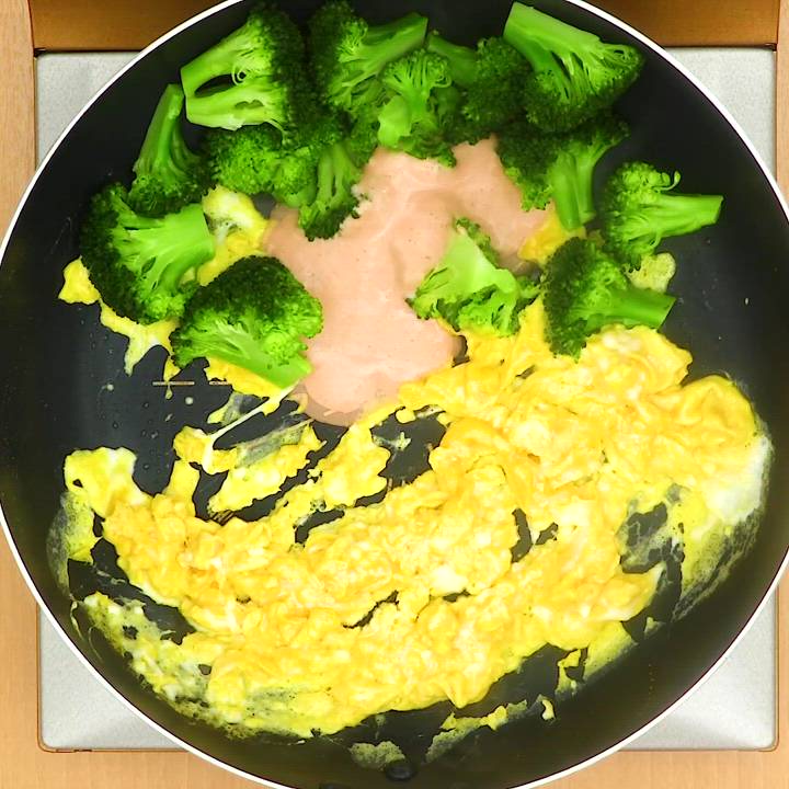 ブロッコリーを端によせて、空いたところにサラダ油を入れて熱する。溶き卵を加えて半熟状になるまで菜箸で大きくかき混ぜる。☆を加えて全体を炒め合わせる。