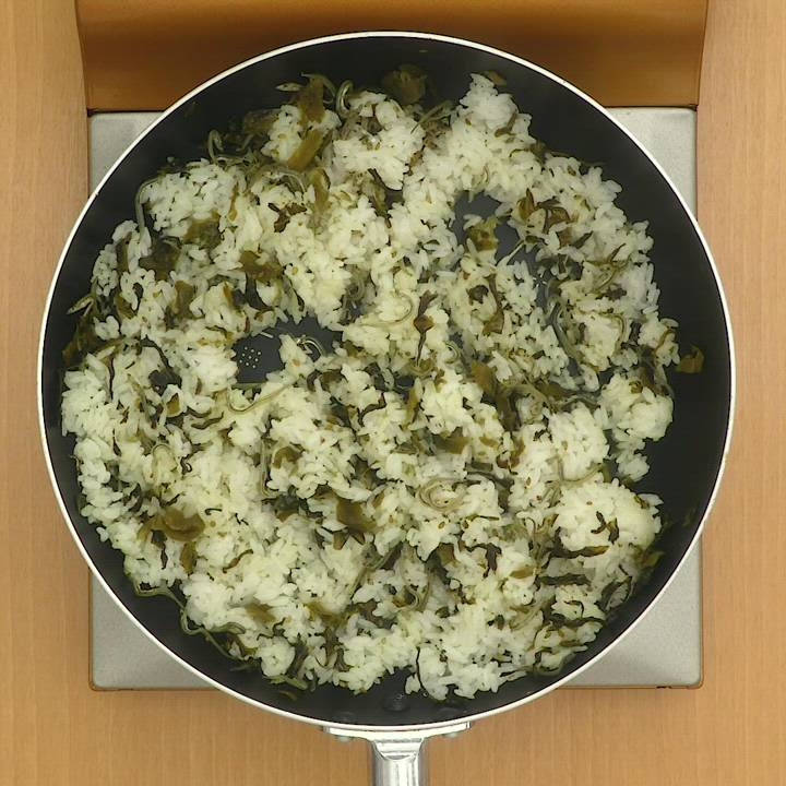 3のフライパンに残りのサラダ油(大さじ1/2)入れて熱し、ごはんを加えてほぐしながら中火で炒め、高菜漬け、小女子を加えて炒める。