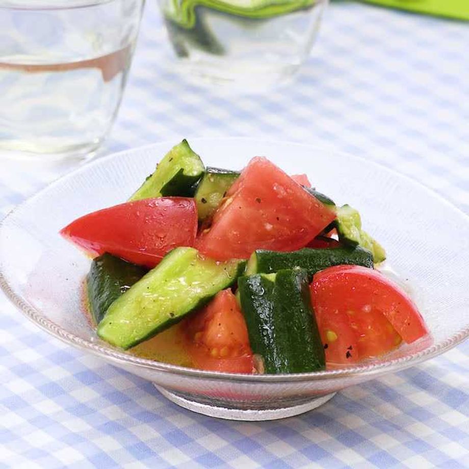 きゅうりは両端を切り落とし、めん棒で少し形がくずれるまで叩く。食べやすい大きさに切る。トマトはへたをくりぬき、一口大に切る。