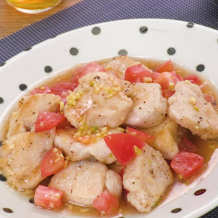 鶏むね肉は片栗粉をまぶして焼くことでパサつきを抑えてしっとりとした焼き上がりに♪フレッシュなトマトを使うことでおいしさが引き立ちます♪