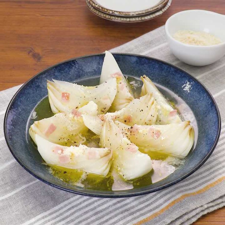 耐熱容器に☆を加えて混ぜ、玉ねぎを並べてふんわりとラップをし、600Wのレンジで5分加熱する。取り出して玉ねぎに☆をかけ、ベーコンをのせる。再度ふんわりとラップをし、同様に3〜4分加熱する。