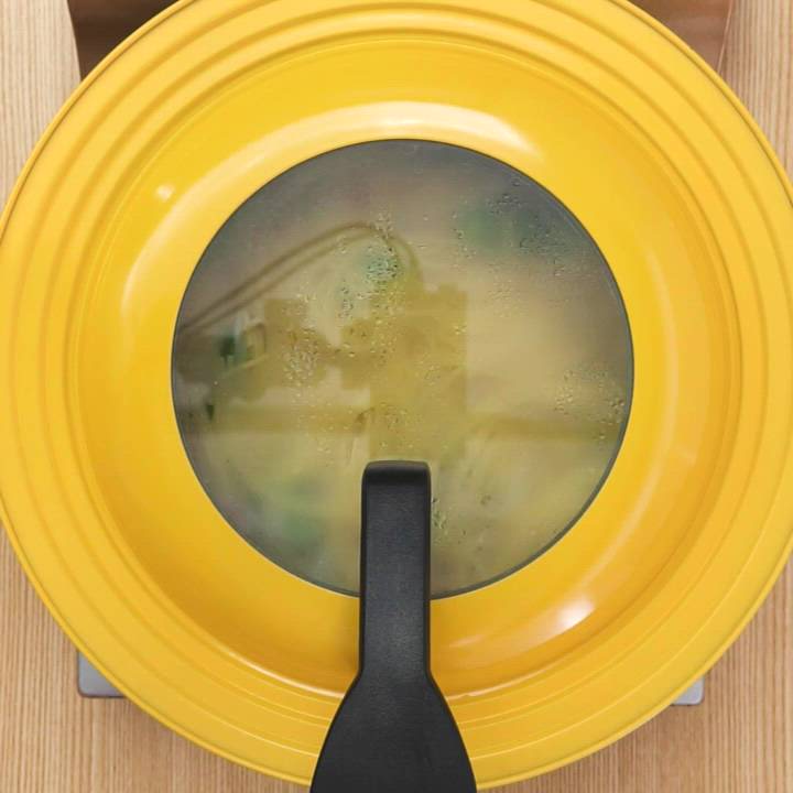 水、塩、こしょうを加えて混ぜ、煮立たせる。スパゲティを半分に折って加え、ひと混ぜする。ふたをして弱火で袋の表示時間より2分短くゆでる。