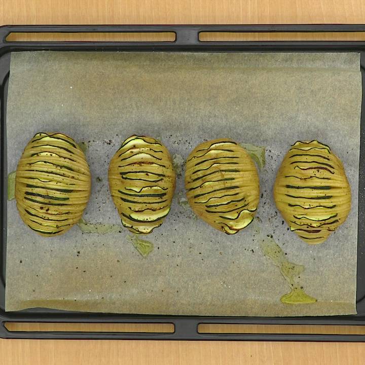 じゃがいもの切り込みにズッキーニをはさむ。天板にクッキングシートを敷いてじゃがいもをのせ、塩こしょうをふり、オリーブオイルをまわしかける。230℃に予熱したオーブンで25分程焼く。