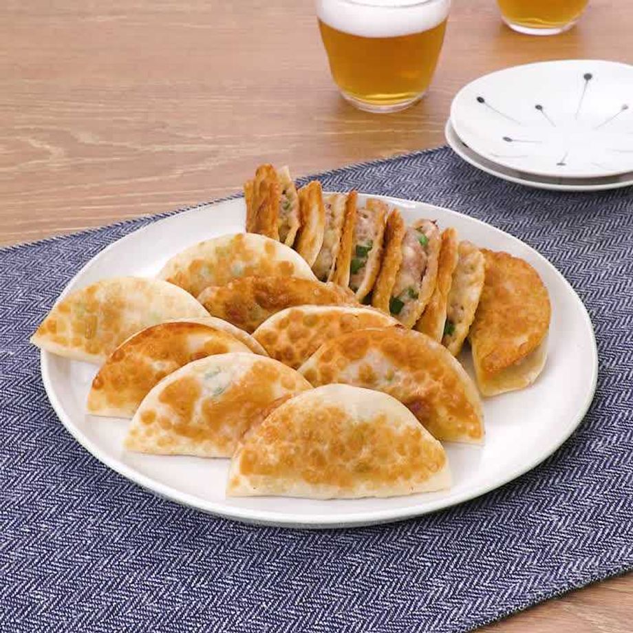 餃子の皮1枚に餃子あんを1/15量しぼり、折りたたむ。同様に計15個作る。