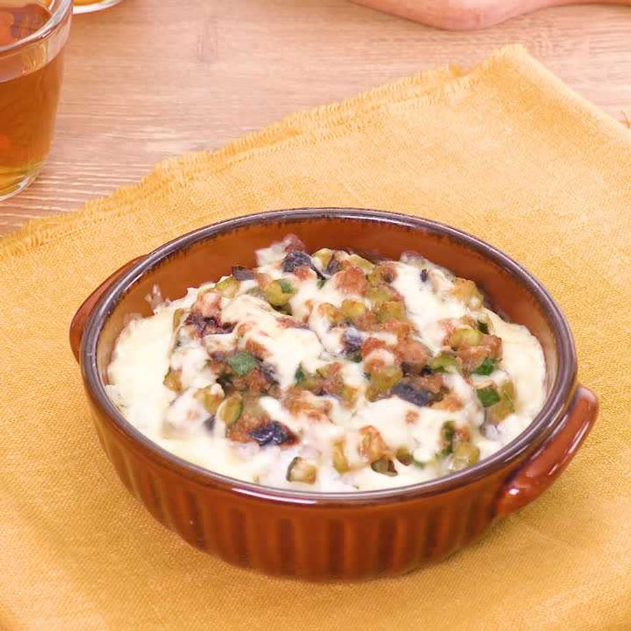 別の耐熱容器にごはんを等分に入れ、2、ピザ用チーズを順に等分にのせる。トースターでこんがりと焼き色がつくまで10分〜15分程焼く。