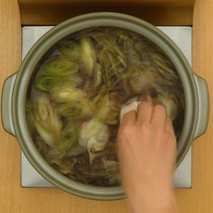 だまこ、せりの根を加えて中火で煮立たせ、だまこを裏に返しながら4〜5分ほど煮る。せりの茎、葉を加えてさっと煮る。