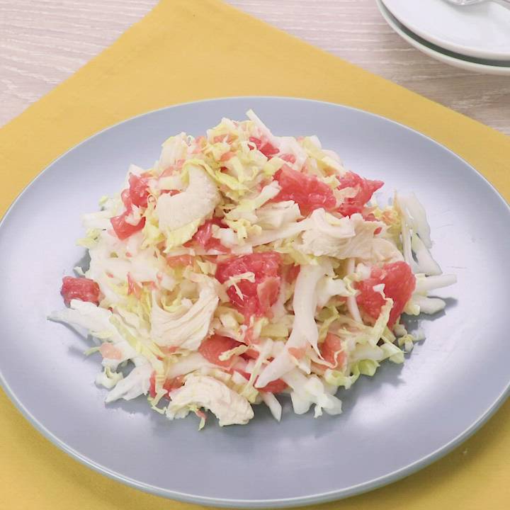 白菜を生で食べるサラダです!柔らかい葉とシャキシャキした芯が美味しく、みずみずしいグレープフルーツと合わせて爽やかに仕上げました。今回はルビーグレープフルーツを使用しています。わさび醤油のドレッシングが意外と合うのでオススメです♪