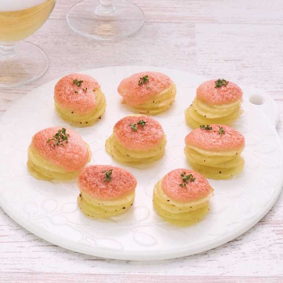 薄切りにしたじゃがいもを積み重ね、カリッと焼き上げた簡単レシピをご紹介♪人気の明太マヨソースをかけて、止まらないおいしさに仕上げました。パクッと食べやすい大きさなので、おつまみやパーティーシーンなどにおすすめです。