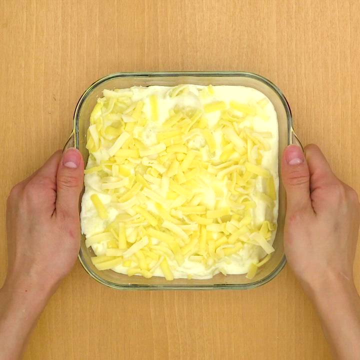 2のグラタン皿にホワイトソースを入れ、ピザ用チーズをちらす。トースターでピザ用チーズに焼き色がつくまで10分ほど焼く。パセリをちらす。