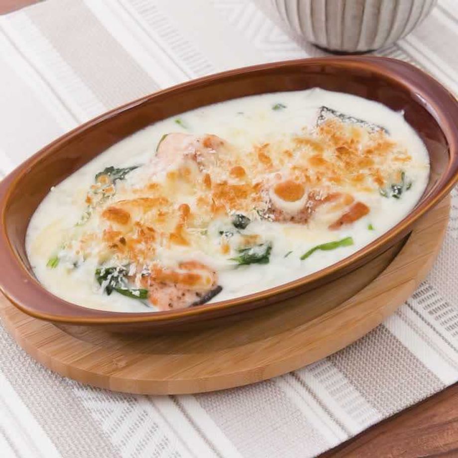 鮭とほうれん草の彩りのきれいなグラタンをご紹介します!ダマになりやすいホワイトソースはレンジで作れば失敗知らず♪レンジとコンロをうまく組み合わせて時短調理ができるレシピです。