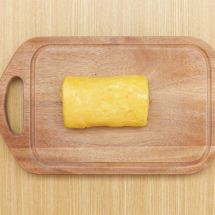 空いたところから溶き卵を1/4量流し入れ、卵が半熟状になったら奥から手前に向かって折りたたむようにして巻き、奥に寄せる。これを卵液がなくなるまで繰り返す。