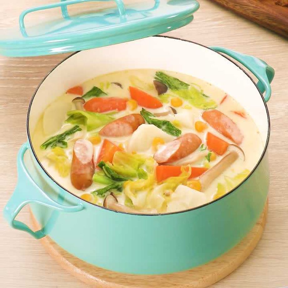 コーンクリームの甘さが野菜やソーセージのうまみを引き立たせます♪シメはごはんを入れてリゾットにしたり、パスタを入れてクリームパスタにするのもおすすめ。きのこや鶏肉などお好きな材料でアレンジ可能です!
