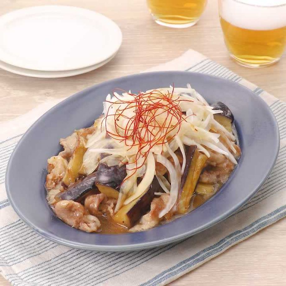 甘辛豚となすの新玉ねぎのせ